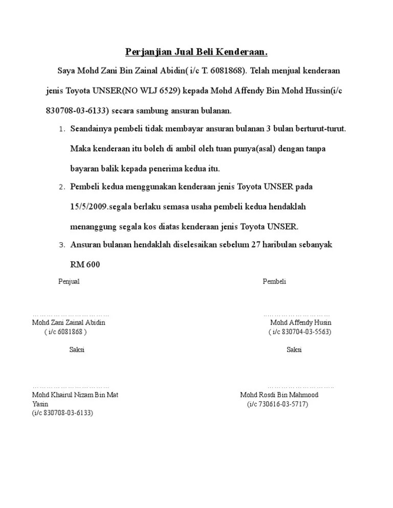 Surat perjanjian jual beli kereta kaedah sambung bayar surat perjanjian sambung bayar kenderaan surat perjanjian ini dimana kita mempunyai kereta yang . Surat perjanjian jual beli kereta sambung bayar 1. Surat perjanjian jual beli kereta kaedah sambung bayar 1. Pembeli hendaklah berrtanggungjawab atas apa jua perkara yang berkaitan dengan saman kereta dan .